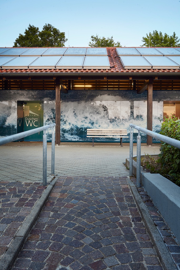 Die in die Jahre gekommenen Sanitärbereiche wurde abgebrochen und in vergrößertem Umfang erneuert. Der neue Baukörper steht frei unter der bestehenden Dachkonstruktion und schiebt sich in südl. Richtung unter dieser heraus.